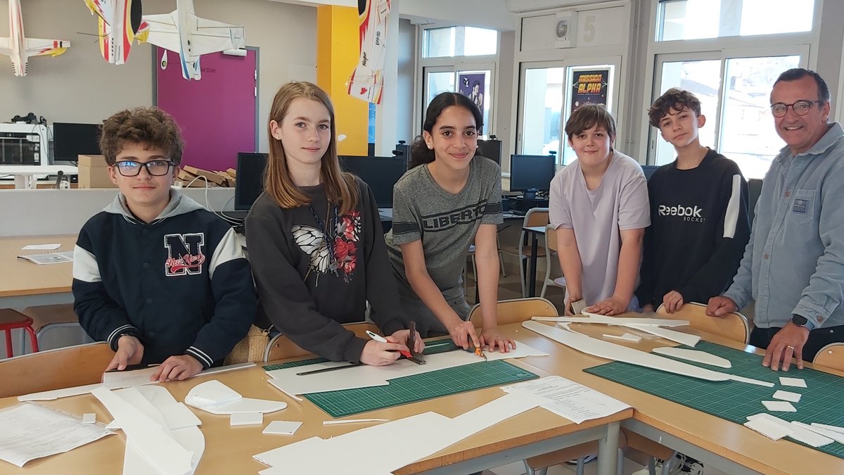Todas as terças-feiras, a partir das 17h, doze alunos do sexto ano se reúnem voluntariamente na sala de tecnologia junto com seu professor, Jérôme Bournet. O número limitado de vagas aumenta o entusiasmo por este workshop. Os participantes trabalham em um projeto concreto: projetar e fabricar aeromodelos gratuitos.