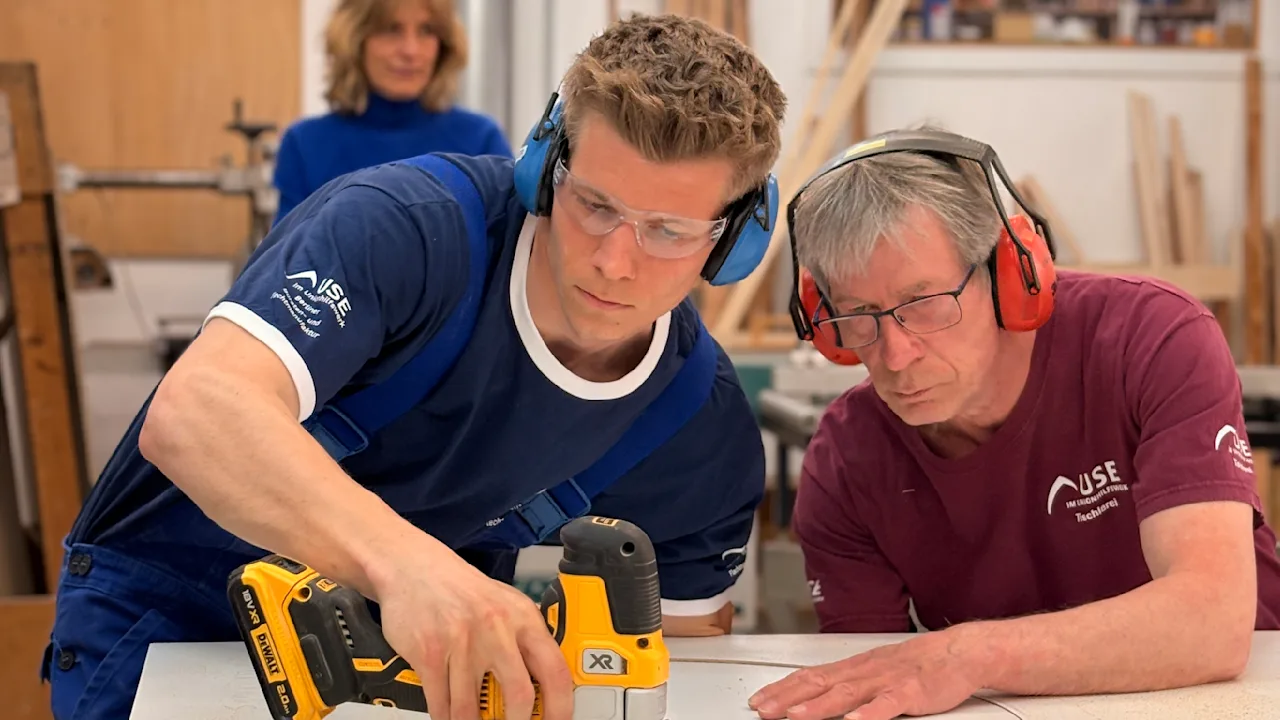 Não é por acaso que Schuler também tem uma boa figura aqui! Esse Hertha-Stryker é um carpinteiro treinado. Trabalhou na oficina do avô, fez estágio em Kaiserslautern e hoje serra por uma boa causa. É como se ele nunca tivesse saído da oficina: fala jargão técnico, trabalha com régua dobrável com precisão milimétrica e manuseia circulares como se nunca tivesse feito mais nada. “De qualquer forma, é divertido! Só o cheiro traz lembranças quando vou ao workshop”, diz Schuller para o BILD no workshop.