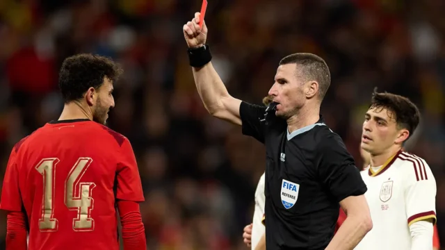 O árbitro (M.) mostra o cartão vermelho: o jogador que vir o vermelho deve abandonar o campo imediatamente. (Crédito: IMAGO/David Ramirez)