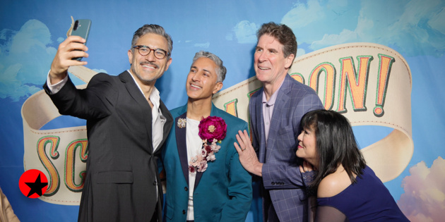 “Shmigadoon!” Ivan Hernandez, Maulik Pancholi, Cinco Paul e Anne Harada no tapete da noite de abertura de