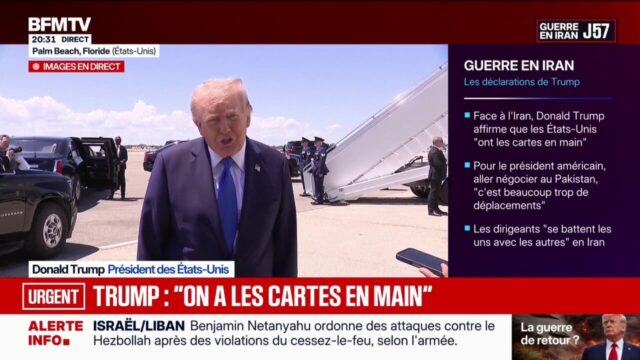 Home Notícias Irã: ‘Temos todas as cartas’, diz Donald Trump Notícias Irã: ‘Temos todas as cartas’, diz Donald Trump By Catarina Alves - 25 abril 2026 6 0 FacebookTwitterPinterestWhatsApp Irã: ‘Temos todas as cartas’, diz Donald Trump No mesmo assunto 4:27 Armada Americana no Médio Oriente: “A primeira parte desta guerra mostrou que o Irão estava preparado”, diz Jean-Paul Palomeros, antigo chefe do Estado-Maior da Força Aérea. 5:50 Irão: Donald Trump justifica a sua recusa em enviar representantes ao Paquistão leitura Irã: ‘Temos todas as cartas’, diz Donald Trump 13h30 Negociações Irã-Paquistão: ‘São viagens demais’, diz Donald Trump 1:45 Segundo a mídia iraniana, o Irã está “preparando-se para lançar o maior ataque com mísseis da história contra Israel e bases dos EUA” no Oriente Médio. 1:26 Donald Trump cancelou o envio de uma delegação americana ao Paquistão, considerando que os conselheiros americanos “não vão fazer um voo de 18 horas para sentar e não discutir nada”. 3:28 Irã: Donald Trump cancela envio de delegação americana ao Paquistão 1:39 Hostilidades renovadas entre o Irão e os EUA?: “Objetivamente falando, Donald Trump não está interessado em atacar o Irão”, explica Adel Bakawan, diretor do Instituto Europeu de Estudos do Médio Oriente e do Norte de África. 3:05 Estreito de Ormuz: petroleiro ligado a Teerã foi forçado a voltar devido ao bloqueio dos EUA 3:10 Irã, Estreito de Ormuz: “Para entender o que está acontecendo hoje, estamos diante de um trilema”, explica Gilles Gressani, diretor da revista geopolítica Grand Continent. 1:39 Petróleo: “Se (as tensões no Médio Oriente) continuarem por mais dois ou três meses, haverá de facto problemas de abastecimento”, explica Jean-Louis Schilansky, antigo presidente da União Francesa do Petróleo. 2:15 LES ÉCLAREURS – Petróleo: como não passar pelo Estreito de Ormuz? 1:20 Na sua rede social, Donald Trump indicou que “se os iranianos quiserem conversar, basta ligar”. 1:28 Após a guerra no Médio Oriente, os lucros dos distribuidores de combustíveis aumentaram. Fonte